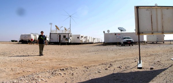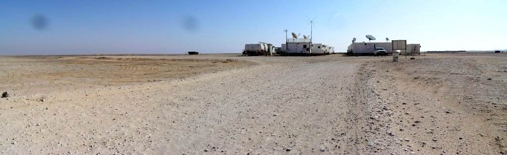 After a few formalities at the rig, we headed back to the rig camp. The camps where the rig crew stay are always a couple of kilometers away from the rigs. I think this is to keep the noise down. Anyway, here is the camp in the distance as we're driving up to it. You might have to scroll to the right to see all of this picture.