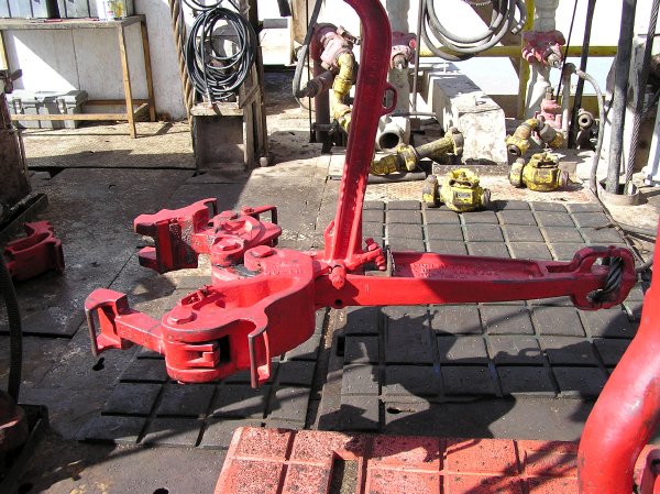 A few days later I took some photos on the rig floor. Here's the "tongs", which are the things they use to tighten and loosen the drill pipe joints.