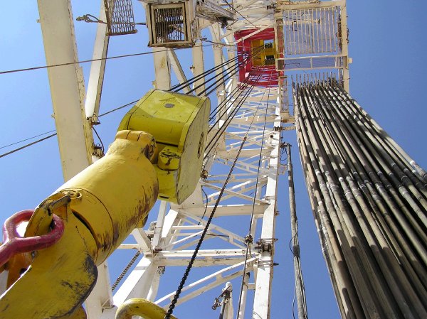 I took this next picture standing on the rotary table looking up. It looks up the centre of the mast. To the right are the 90ft stands of drill pipe waiting to be used, and the big yellow thing is the crane hook that picks up the 5km long drill string in the hole.