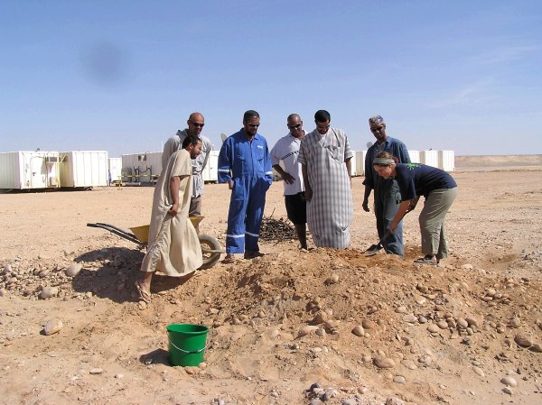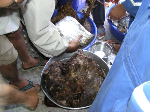 As it turns out there are a few special treats which form the basis of the Omani Eid feast. Most important of all is shua which is very much like a Maori hungi. To make shua, you first light a big fire to heat up the ground. Then you dig a big hole in which to put some freshly slaughtered meat. And when I say freshly slaughtered, I mean it! The meat is still warm when it is put in the earth oven. We obviously had sheep and goat, but camel is also popular. The whole joints of meat are seasoned with salt, pepper, tamarind and a few other goodies, before being wrapped up in foil, then in some sort of a woven reed bags and placed in the hot pit. I think traditionally these pits were lined with hot rocks, but here at an oil rig camp, it was lined in a big steel drum. After the meat has been put into the underground oven, it is sealed tightly and covered with the hot earth and left for 24 hours to cook.