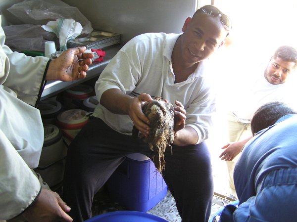 The next day I manage to lie and cheat my way out of the rig and back to the camp in time for the Eid lunch. This is the first day that the Omani's have been able to eat, drink, smoke or swear for a month - Ramadan is over! First treat off the rank is something which I have completely forgotten the name of. I know it might look like it came out of the loo, but luckily it didn't taste like it, especially because the Omani's all crowded around as I was handed this sumptuous appetiser. You see not many westerners join into their festivities and sample their fare, but as you all know I wouldn't miss it for quids! They'd have to fight me off with a stick to keep me off their food, and luckily for me sticks are few and far between in these parts.