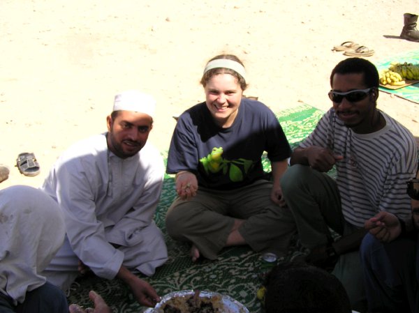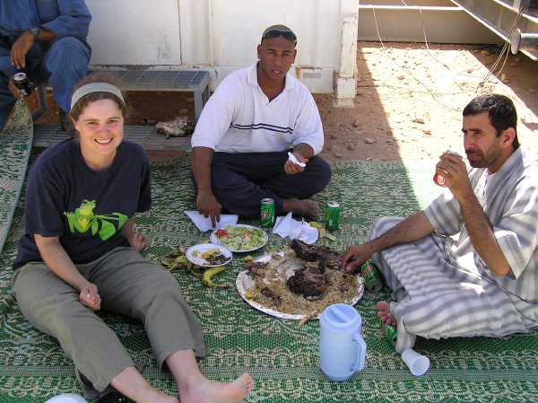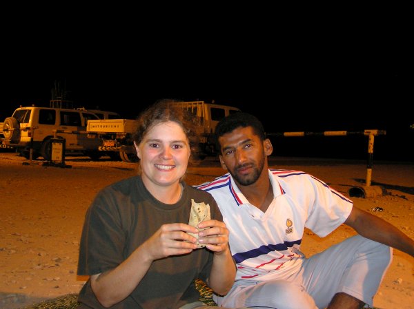 Here's me with one of the rig crew guys. I've got my mishkak wrapped up in a chappati bread and covered in some home-made chill sauce.