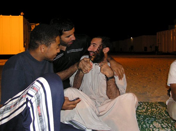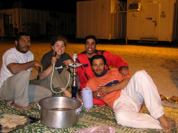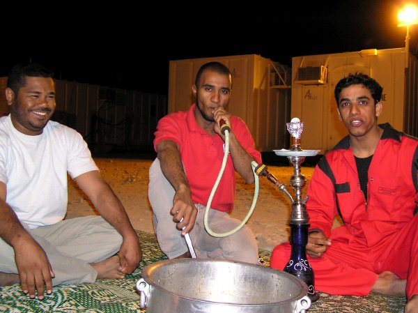 The rig guys tried in earnest to get me to try their shisha, but to no avail. It took a long time to explain that I just don't smoke. I did however consent to a photo with them and the shisha.