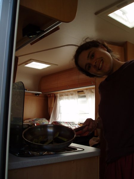Inside our five-star hotel on wheels we've got a double bed, bathroom, fridge, two-burner gas cooker, and a table and chairs. She's also got a cool shade thing that we can wind out the side to sit under. Here I am cooking us up some German sausages and zucchini for dinner.