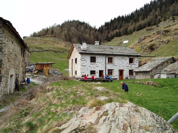It wasn't long (in truth that statement might not be 100% accurate) until we were sitting at the big wooden tables outside the stone cottages at San Romerio, 2000m above Bradley's bed at the valley floor. You can see two people with red tops at the table - I'm the one to the right. Lunch was really lovely, and we scoffed it down like a pair of hungry wolves. Wine was nice too. I think we had two jugs that day...