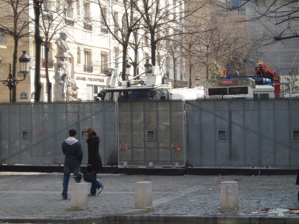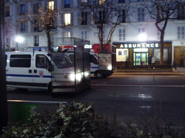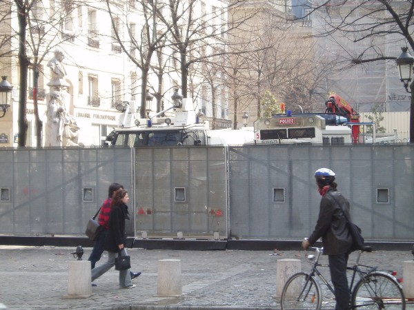 Have a look at the two trucks behind the mobile fence below. The one on the left has two water canons on the roof, and the one on the right is a big police bulldozer truck with a plough on the front.
