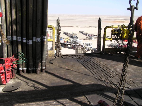 Here's a picture of the ramp which goes up from the ground level to the V-door. All of the drill pipes are dragged up this ramp. It also shows how high off the ground the rig floor is.