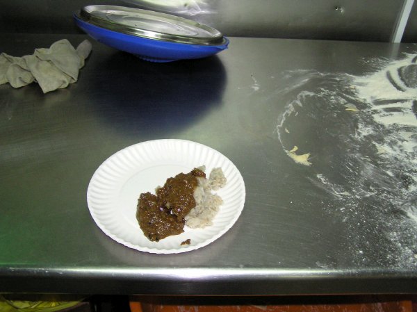 Now back to the dish in question, which is pictured below. This is some sort of a heavy and thick grain based gruel or porridge with a thick boiled meat and tamarind sauce over the top. Not a recipe I'd beg for, but definitely eatable. Very heavy though. I had to sneak half of it into the bin because there was no way I would have been able to eat anything else if I'd finished it.