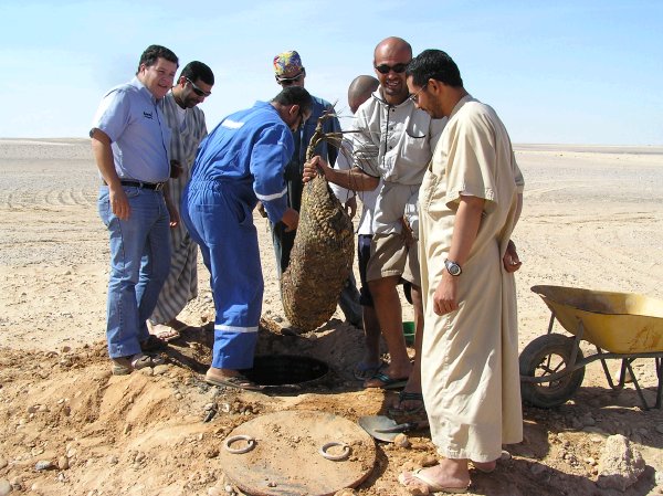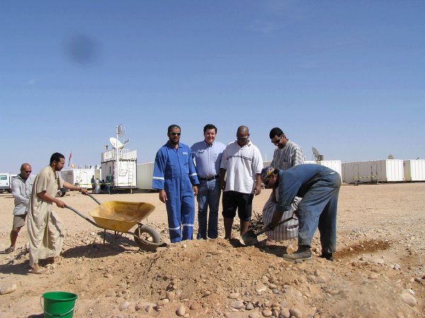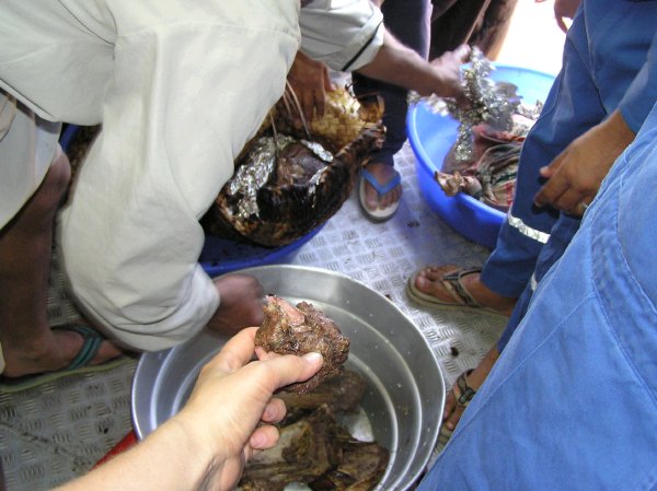 As it turns out there are a few special treats which form the basis of the Omani Eid feast. Most important of all is shua which is very much like a Maori hungi. To make shua, you first light a big fire to heat up the ground. Then you dig a big hole in which to put some freshly slaughtered meat. And when I say freshly slaughtered, I mean it! The meat is still warm when it is put in the earth oven. We obviously had sheep and goat, but camel is also popular. The whole joints of meat are seasoned with salt, pepper, tamarind and a few other goodies, before being wrapped up in foil, then in some sort of a woven reed bags and placed in the hot pit. I think traditionally these pits were lined with hot rocks, but here at an oil rig camp, it was lined in a big steel drum. After the meat has been put into the underground oven, it is sealed tightly and covered with the hot earth and left for 24 hours to cook.
