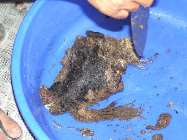 Of all these packages of joints there was one that caught my eye. Glennie's called this one Ramadan the Goat. It turns out that the goat's head is quite a delicacy in this neck of the woods. That was not so surprising to me at all. The thing that threw me though was the fact that they cooked it without skinning it! Or shaving it for that matter! We used to have goats in the back yard and I know from experience that billy goats have a habit of pissing on themselves to improve their attraction to the nannies. Damn those billies stink! Anyway, all I could think of looking at this gaunt fury goat's head was that it was simmered in stale dusty sweat and piss.