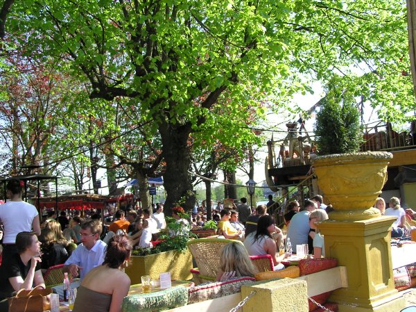 On the other side of the lake there was an amazing beer garden, which was like a dozen smaller beer gardens all made into one. There were tables, chairs, sofas with big cushions, deck chairs, sun umbrellas, shady trees, loads of individual bars, different food huts in all different styles (Asian, Italian, German, etc...); it was great. And it was LOADED with people! You could hire roller blades, bicycles, paddleboats for the lake, shisha pipes; just about anything. For me it was like stepping into Thailand. Most of the fences and huts were made of bamboo in the South East Asian style. Unfortunately all the sofas and deck chairs were taken when we arrived, so we got to sit in an out of the way corner, but it was still lovely.