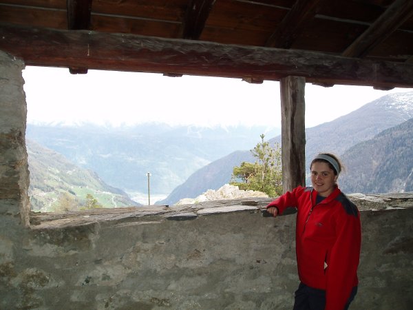 This is me inside the church at San Romerio. It's built on the top of a cliff (literally) that drops hundreds of meters towards the valley below. This opening faces Italy, which starts right at the end of the valley.