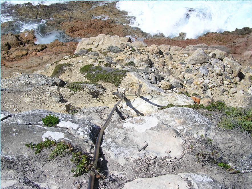 To get to the swimming hole, you need to dangle precariously down a smooth plastic coated rope hanging over a cliff, and once you reach the end of the rope, you climb down a hand made (as opposed to well made) wooden ladder. After this, you simply skirt the base of the cliff on a narrow ledge approximately 100m in length and made up entirely of loose fallen rocks. Simple really, if you're a chimp with a steel skull to deflect any falling rocks from above.